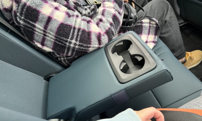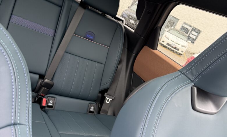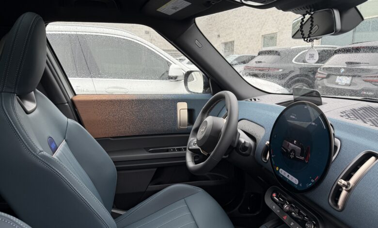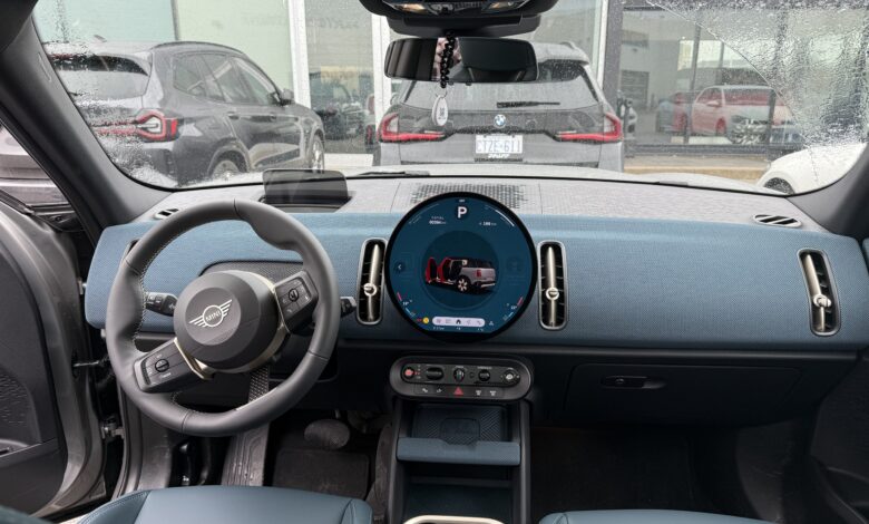 The Mini Countryman SE ALL4 is not mini at all. It is a mid-size SUV. The exterior design is modern looking. The flush handles make the car looks sleek. I like how it looks on the outside and inside. When steeping into the new Countryman, there are three front and rear light signatures, as well as a logo projection next to the front doors. The Mini Countryman SE ALL4 features a minimalist interior design. The sustainably crafted materials with the atmospheric mood lighting makes the interior very stylish. I like the colour combination of the test drive vehicle. I absolutely love the standard circular OLED touchscreen. It is so beautifully looking. “The 9.4” display is made from high-quality glass which lends a distinctive, minimalist appearance to the interior. Nestled in the centre of the MINI Interaction Unit, it serves as the main instrument cluster, as well as your onboard hub for infotainment and assistance.” There is no instrument cluster in front of the driver. The speedometer is located in the top center of the circular infotainment system. It is nice and big in size, which makes it easy to read. There is also a head-up display. I like the steering wheel. It looks sporty and gives you a go-kart feeling. There is a sunroof. There is a small hump on the ground of the back seats. The interior is quite spacious. There is no front trunk.